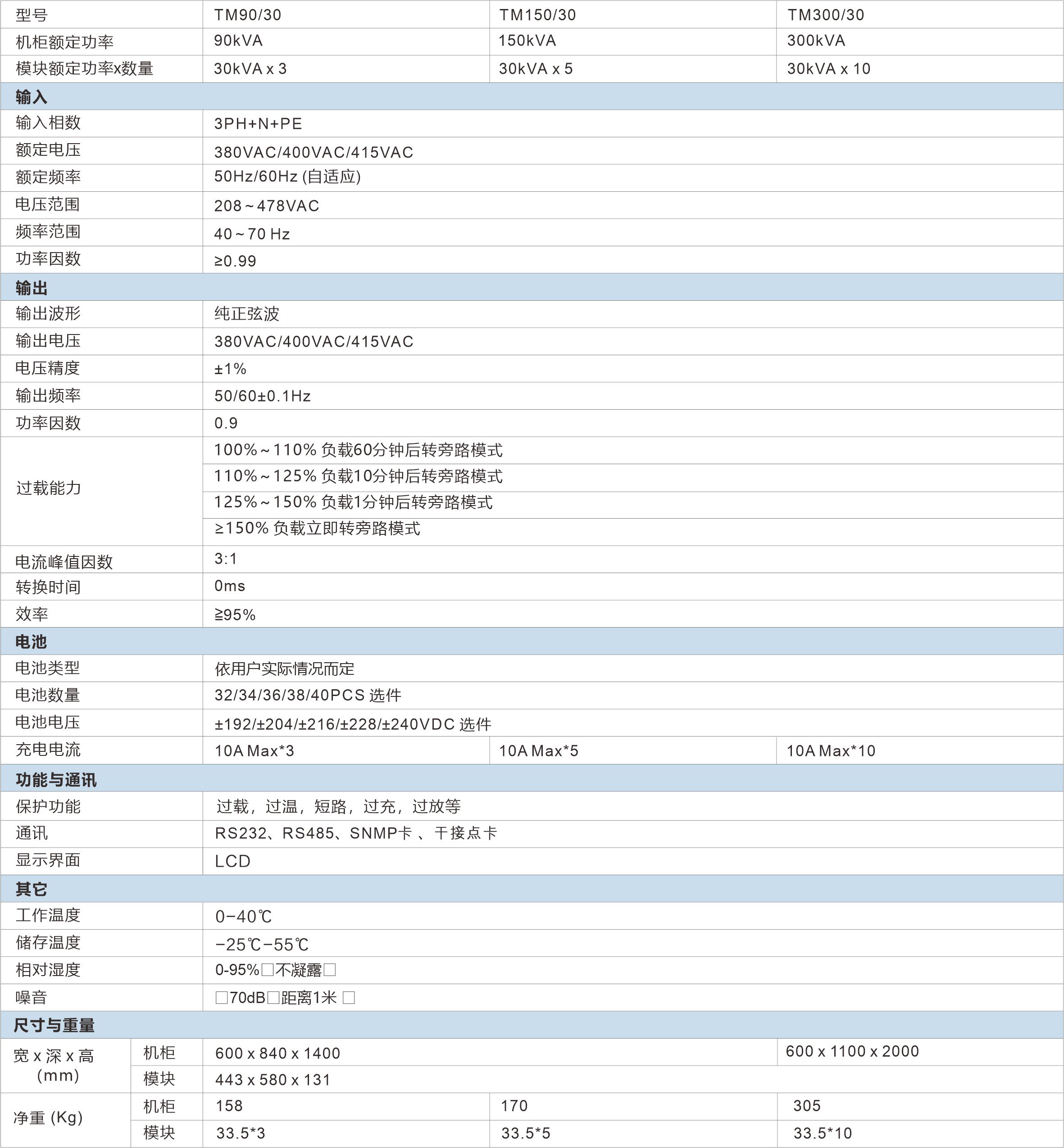 TM 系列在線式模塊化UPS 90kVA-300kVA(3/3)TM 系列采用模塊化設計與 N+X 并聯(lián)冗余技術,產品容量覆蓋 30kVA 到 300kVA 之間,方便用戶靈活配置與逐步投資。該系列 UPS 可以解決各種的電源問題,如斷電、市電高壓、市電低壓、電壓瞬間跌落、減幅振蕩、高壓脈沖、電壓波動、浪涌電壓、諧波失真、雜波干擾、頻率波動等電源問題。