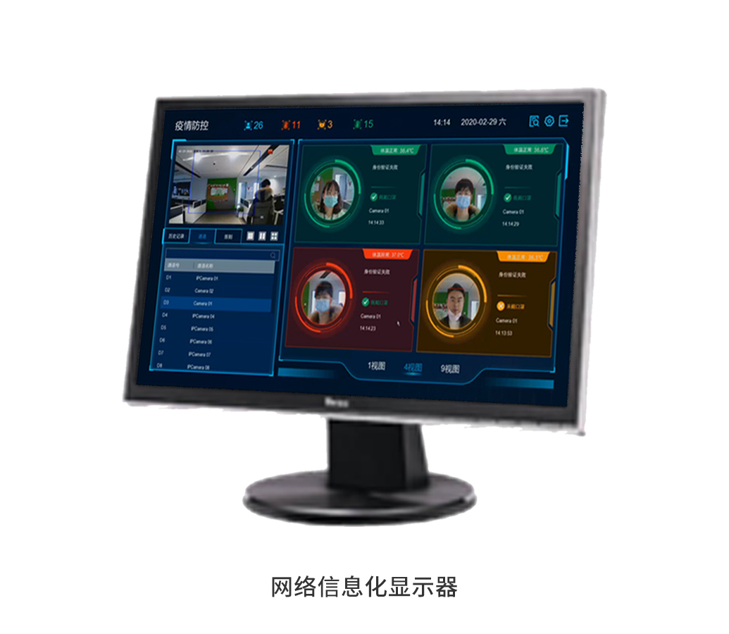 熱成像集群測溫系統(tǒng)熱成像集群測溫系統(tǒng),由測溫半球機(jī)、校準(zhǔn)黑體、全能小超腦、網(wǎng)絡(luò)信息化顯示器、Wed端人員管理系統(tǒng)構(gòu)成,集視頻監(jiān)控、熱成像測溫功能于一體,測量距離0.8-4.5m,可同時人臉識別20人測溫,無感通過。人性化疫情防控界面,實(shí)時高溫異常/未佩戴口罩/體溫正常人數(shù)統(tǒng)計,人臉多幀抓拍,顯示最優(yōu)人臉圖,廣泛應(yīng)用于學(xué)校、公園、會場等疫情防控場所。