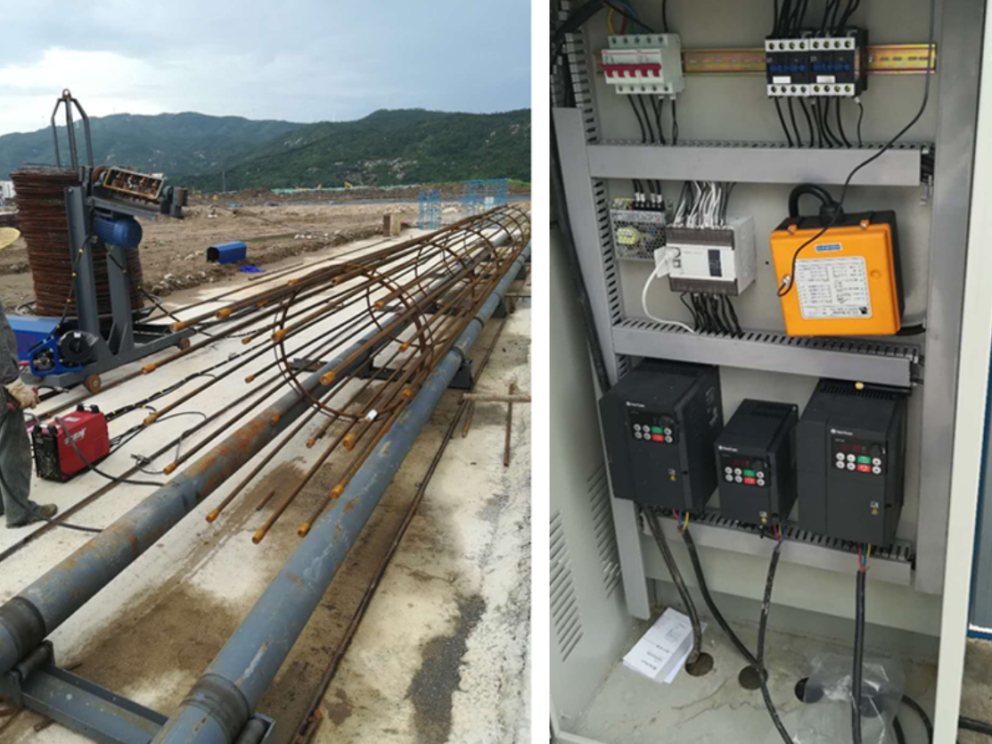 起始焊接:在鋼筋籠的頭部,固定旋轉(zhuǎn)盤和移動旋轉(zhuǎn)盤同步旋轉(zhuǎn)運行,將盤筋連續(xù)繞幾圈,然后與主筋焊接牢固。