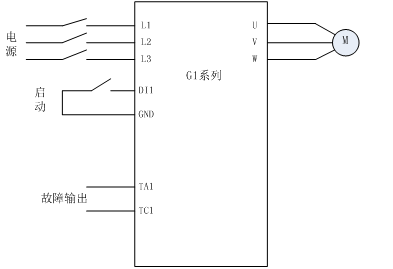 采用G1系列矢量型通用變頻器驅(qū)動(dòng)擠出機(jī)組螺桿主機(jī),V/F控制,鍵盤外拉10米左右,鍵盤電位器調(diào)速,外部端子啟停,故障信號(hào)輸出。