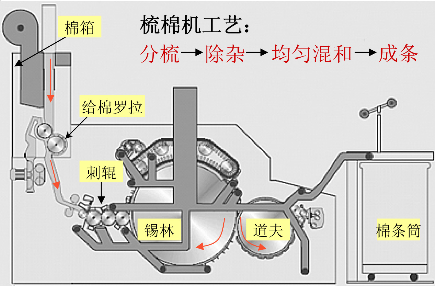 梳棉機(jī)是介于開(kāi)清棉聯(lián)合機(jī)和并條機(jī)之間,主要是用來(lái)加工棉纖維和化學(xué)纖維的一種棉紡織機(jī)械。通過(guò)將上道工序開(kāi)清棉聯(lián)合機(jī)送來(lái)的棉(化纖)層進(jìn)行開(kāi)松分梳除雜,使所有呈卷曲、塊狀的棉團(tuán)成為基本伸直的單纖維狀態(tài),并在此過(guò)程中,除掉清花工序遺留下來(lái)的破籽、雜質(zhì)和短絨,然后集束成一定規(guī)格的棉條,儲(chǔ)存于條筒內(nèi),供并條工序使用。