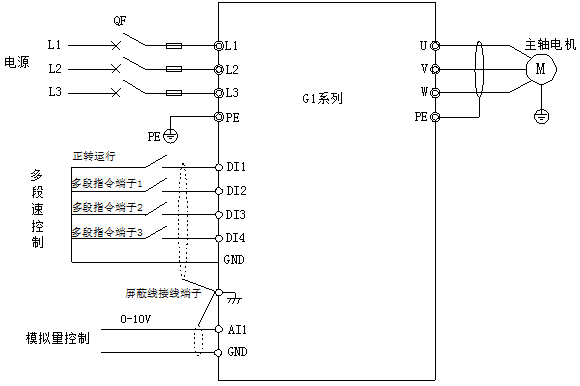 主軸變頻器頻率設(shè)定源有兩種:多段速(7段)、模擬量0-10V,實(shí)際使用中請(qǐng)用戶根據(jù)控制卡實(shí)際提供信號(hào)來(lái)選擇其中一種接線方式,并設(shè)置相對(duì)應(yīng)參數(shù)即可。