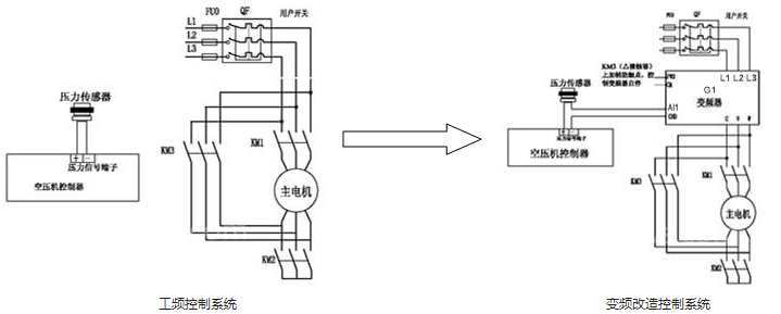 (1)壓力傳感器信號(hào):原有系統(tǒng)中壓力傳感器信號(hào)只接入空壓機(jī)控制器,改造后,需要壓力傳感器信號(hào)作為PID控制的反饋信號(hào),所以需要將壓力傳感器信號(hào)(4~20mA)串聯(lián)接入控制器和變頻器模擬電流輸入端AI1;