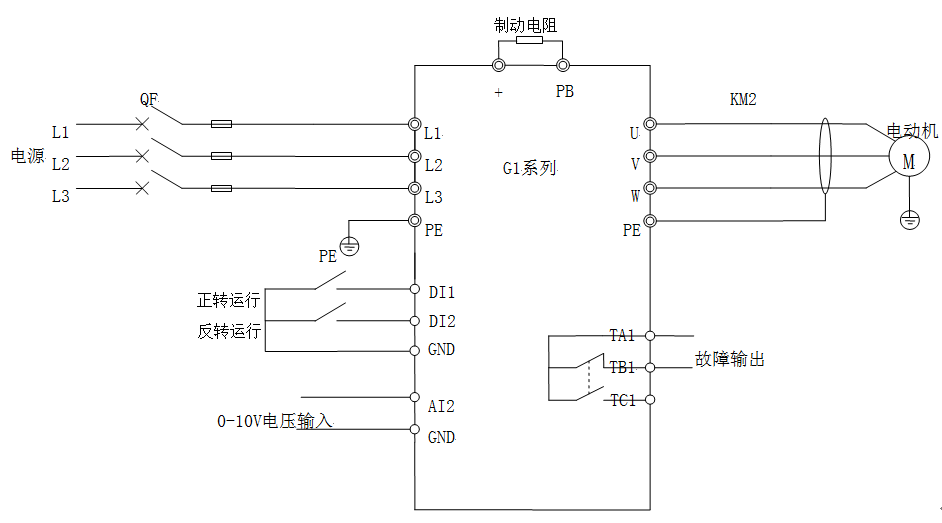 本方案采用G1系列矢量型通用變頻器驅(qū)動(dòng)車床主軸電動(dòng)機(jī),開(kāi)環(huán)矢量控制方式,模擬量(0 ~ 10V)給定頻率,外部端子啟停,故障信號(hào)輸出。為了更快速的減速停機(jī),變頻器需配置合適大小的制動(dòng)電阻。