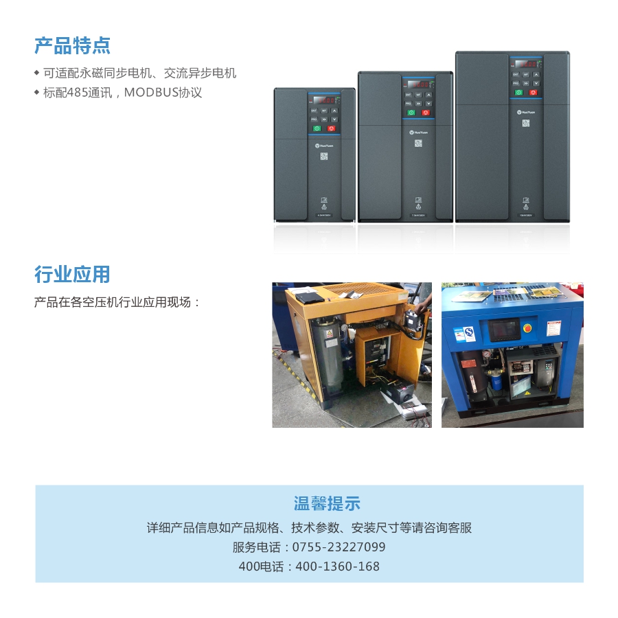 Z100-K系列永磁同步空壓機專用變頻器Z100-K系列永磁同步空壓機專用變頻器是一款永磁同步產品,主要用于驅動同步機,功率為5.5kW-37kW。Z100-K系列采用先進的矢量控制技術,內置電機參數辨識,低頻輸出力矩大、動態(tài)響應迅速、過載能力強,模塊化的控制組件和豐富的擴展功能,可廣泛應用于空壓機、機床、紡織、塑料、化工等行業(yè)。