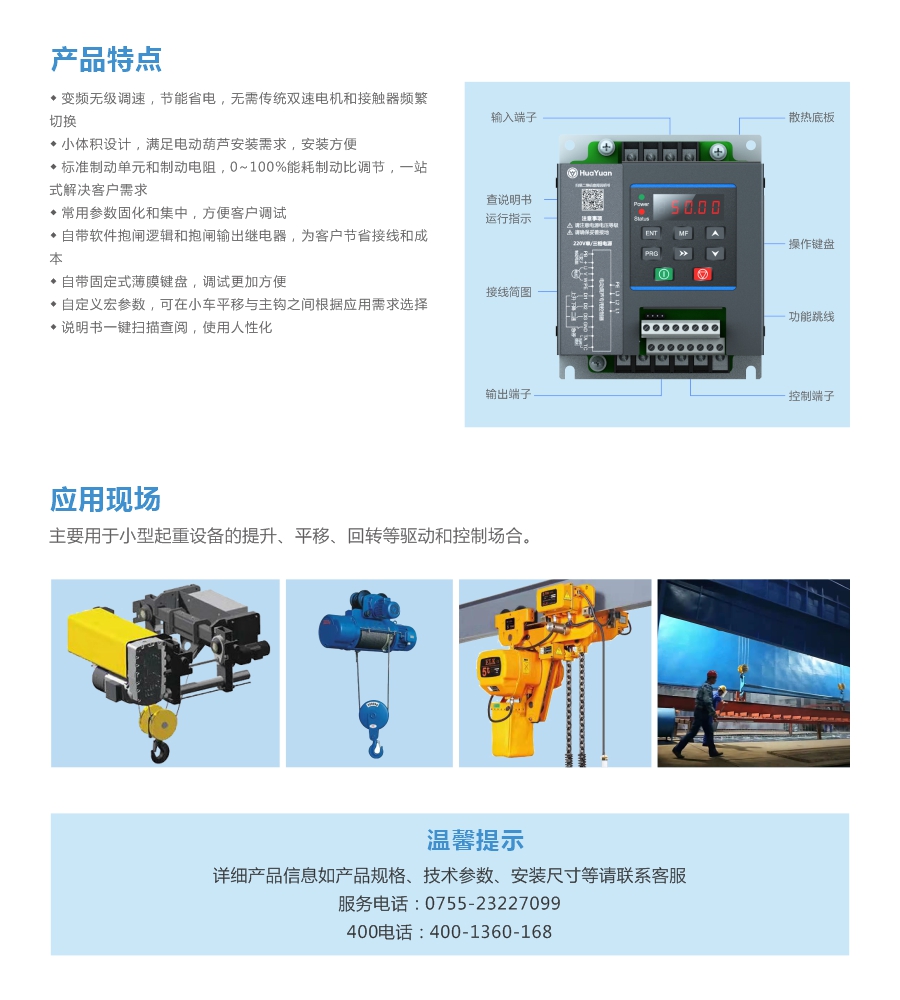 Z210系列電動(dòng)葫蘆專用變頻器Z210-HL系列是在第一代電葫蘆變頻器Z200-HL的基礎(chǔ)上進(jìn)行的升級(jí)優(yōu)化。意在區(qū)分同質(zhì)化的電葫蘆專機(jī)市場(chǎng),為用戶提供更人性化的產(chǎn)品。 在原有的性能基礎(chǔ)上增加了固定式鍵盤和LED顯示屏,可視化更強(qiáng),參數(shù)調(diào)節(jié)更簡(jiǎn)單。 通過手機(jī)掃描產(chǎn)品標(biāo)簽上的二維碼可查閱說明書,使用更便捷。