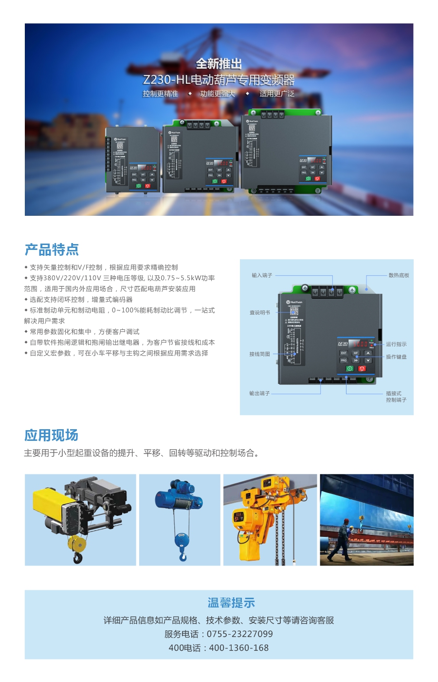 Z230系列電動葫蘆專用變頻器Z230-HL系列是公司于2022年推出的全新電葫蘆專用變頻器。意在深入電動葫蘆專用變頻器市場,且面向更精確智能、便捷安全的控制運(yùn)用。 配備傳統(tǒng)的V/F控制的同時,新增開環(huán)/閉環(huán)矢量控制,更符合電葫蘆專機(jī)的邏輯算法,做到更精確高效。同樣配備抱閘控制功能,以及各種主信號輸入端口。 該系列屬于高性能產(chǎn)品定位,保護(hù)功能齊全優(yōu)異,支持380V/220V/110V三種電壓等級,適用于國內(nèi)外中小型起重設(shè)備的提升、平移、回轉(zhuǎn)和控制等場合。