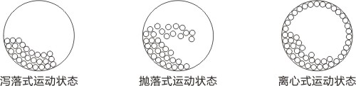 (3) 離心式運(yùn)動(dòng)狀態(tài):當(dāng)筒體轉(zhuǎn)速過高時(shí),由于離心力的作用,研磨體“貼附”在筒體內(nèi)壁上與筒體一道做旋轉(zhuǎn)運(yùn)動(dòng)而不再拋落,在離心式運(yùn)動(dòng)中,研磨體不再對(duì)物料產(chǎn)生碰擊和研磨作用,物料則不會(huì)被粉碎。