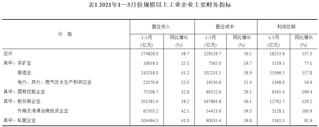 1—3月份,全國規(guī)模以上工業(yè)企業(yè)實(shí)現(xiàn)利潤總額18253.8億元,同比增長1.37倍(按可比口徑計(jì)算,詳見附注二),比2019年1—3月份增長50.2%,兩年平均增長22.6%。