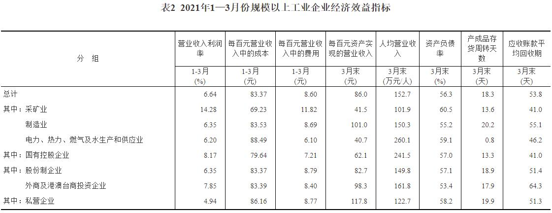 1—3月份,規(guī)模以上工業(yè)企業(yè)實(shí)現(xiàn)營業(yè)收入27.48萬億元,同比增長38.7%;發(fā)生營業(yè)成本22.91萬億元,增長36.5%;營業(yè)收入利潤率為6.64%,同比提高2.76個(gè)百分點(diǎn)。